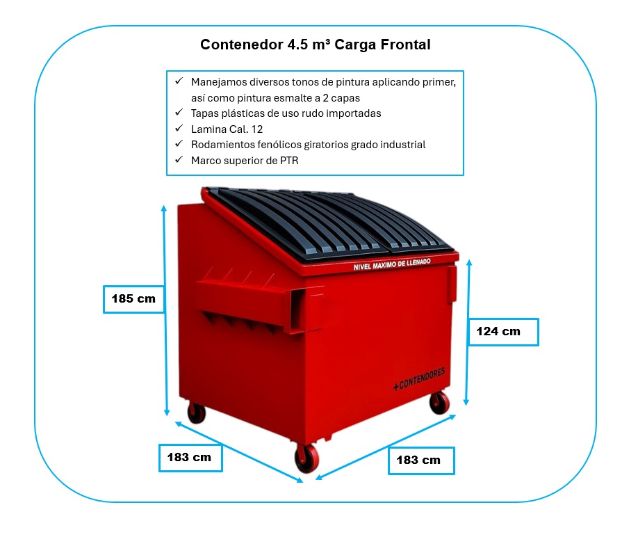 -Nuestros contenedores para Basura Industriales de 4.5 metros cúbicos están diseñados para proporcionar una solución de gestión de residuos eficiente para entornos industriales y comerciales que requieren una alta capacidad de almacenamiento.