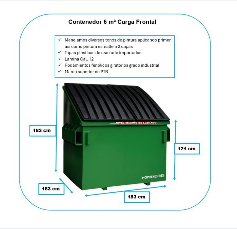 -Nuestro contenedor metálico industrial de 6 m3 lo fabricamos contemplando piso y muros en lámina cal 12. Muros de PTR de 3* 1 1/2″.