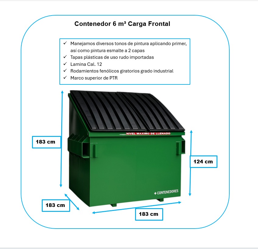 -Contenedor metalico industrial de carga frontal con capacidad de de 6 m3 son ideales para industrias que continuamente tienen grandes cantidades de residuos solidos y voluminosos.