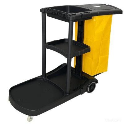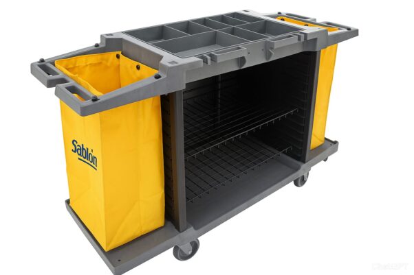 El Carrito Multifuncional Sablón con Doble Bolsa para Camarista incluye 2 bolsas de 75 litros, asas ergonómicas, ruedas de 14 cm y ganchos para accesorios. Ideal para uso institucional.